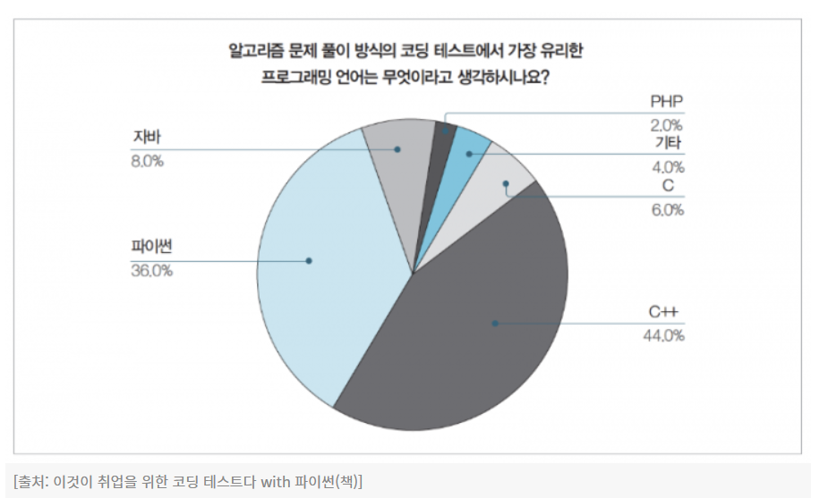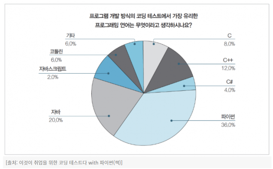 불과 몇 년 전만 하더라도 Python의 경우 코딩 테스트에서 지원하지 않았는데, 점점 코딩 테스트에서 지원하면서 Python으로 코딩 테스트를 보는 사람들이 증가하는 추세이다.