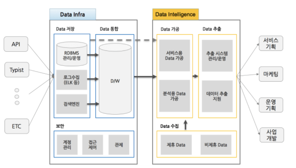 과거 스키마를 짜서 ETL(extract - transfrom - load) 즉, 데이터 추출/스키마에 따라 변형/저장 했던 방대한 데이터 웨어하우스를 기반으로 하던 방식에서 스키마의 형태에 분리됨에 따라 데이터 레이크에 우선 싣고 이후에 가공하는 ELT(extract - load - transform)가 현재 데이터 관리의 흐름.