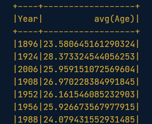 print(athlete_events_spark.groupBy('Year').mean('Age'))