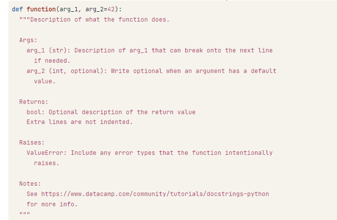 Returns : 반환되는 항목에 대해 설명하는 부분으로 함수의 이름과 설명이 명확해야 설명하기 좋다. 추가 줄은 들여쓰지 않아야 한다.