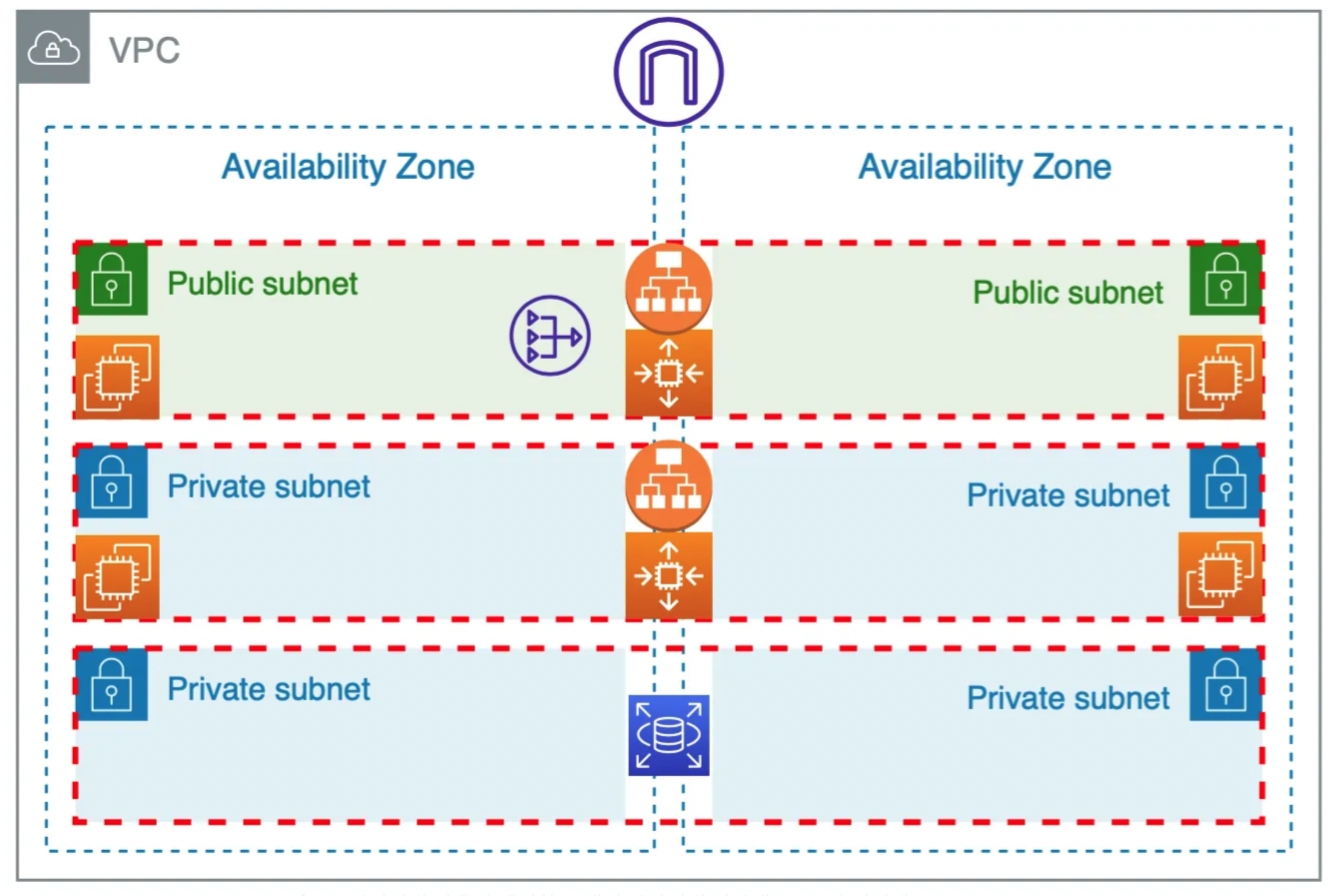 ALB를 통해 Autoscaling 된 EC2, ECS, EKS 등 접근하게 된다. 맨 하단은 DB 영역으로 기본적인 3-Tier 구성이다.