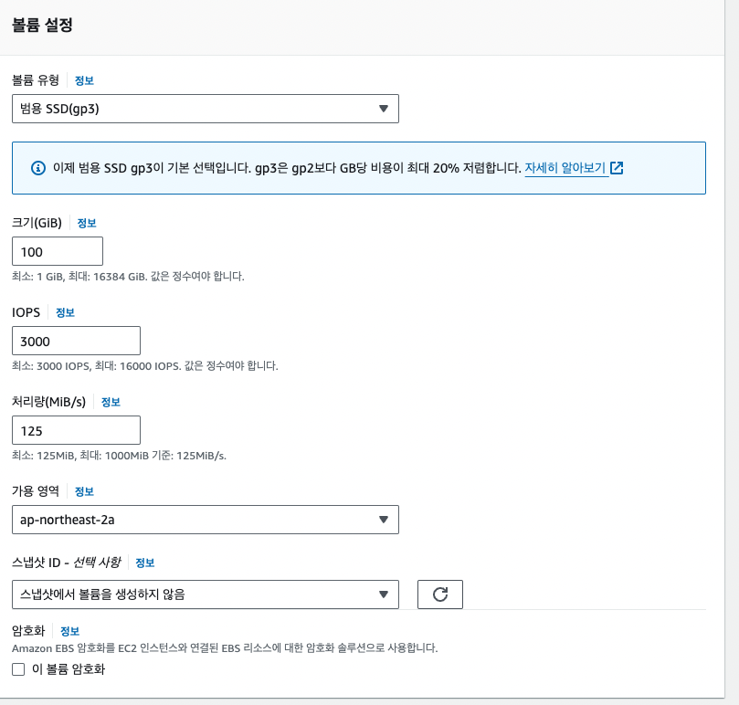 gp3 1000GB 사용, IOPS 3000, 처리량 250MBps => $96.9 (17% 절감)
